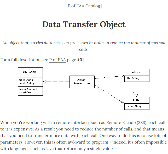 | P of EAA Catalog | Data Transfer Object An object that carries data between processes in order to reduce the number of method calls. For a full description see P of EAA page 401 When you're working with a remote interface, such as Remote Facade (388), ea