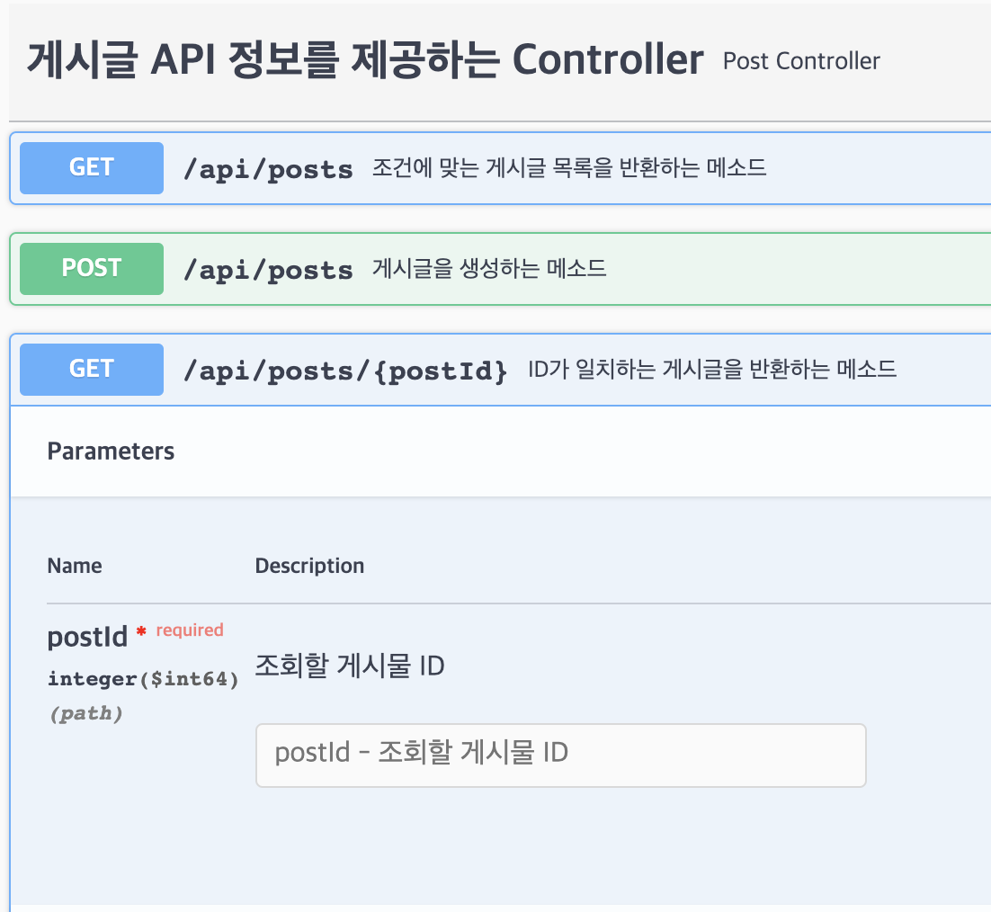 @ApiImplicitParam(name = "postId", value = "조회할 게시물 ID", required = true, dataType = "long")