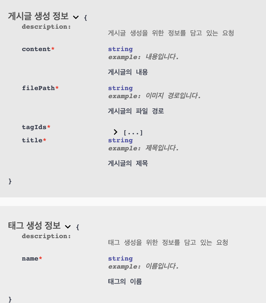 그러나, 이것만으로는 부족하다. 요청으로 들어오는 객체에 대해 어떻게 문서화를 할 수 있을까? 그리고 응답값은 어떻게 문서화할 수 있을까?